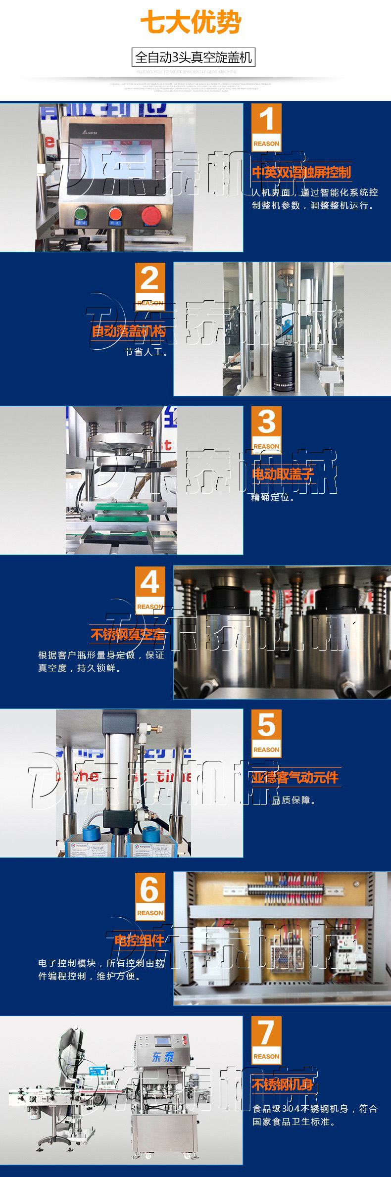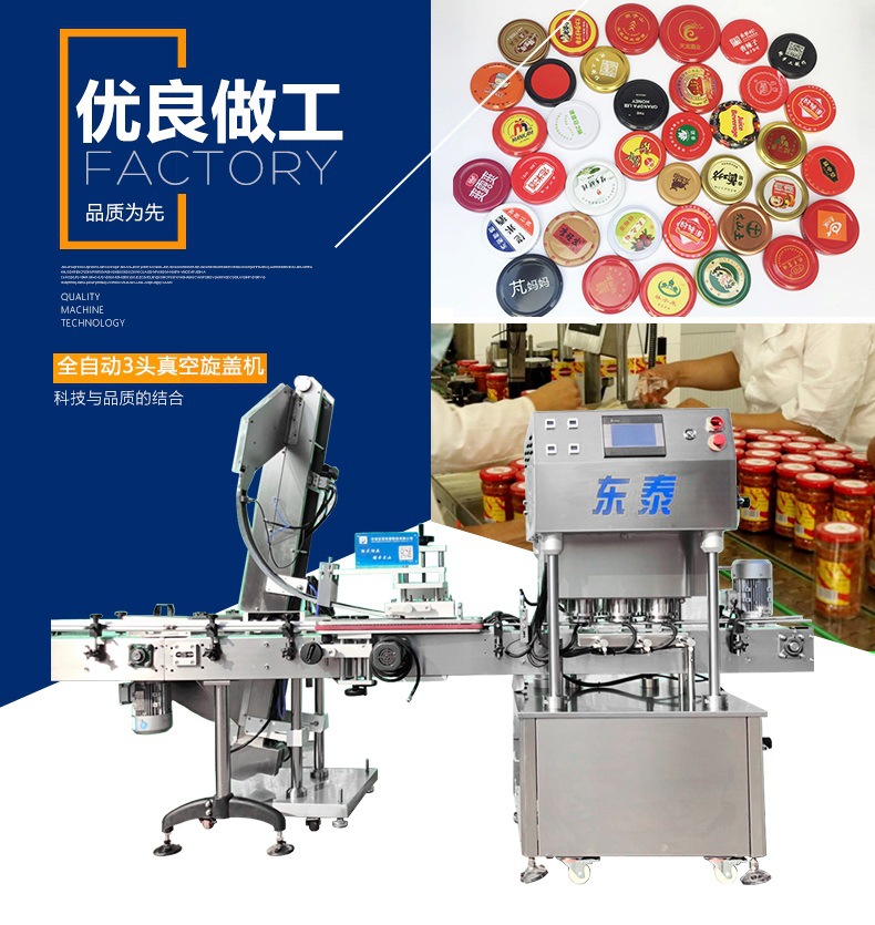 • 全自動三頭真空旋蓋機簡介 該直線式真空旋蓋機是東泰機械結(jié)合用戶使用情況,摒棄了傳統(tǒng)轉(zhuǎn)盤式真空旋蓋機的弊端,研制開發(fā)的新型高效設(shè)備,設(shè)備自動檢測到兩個瓶子蓋子進(jìn)入到雙...