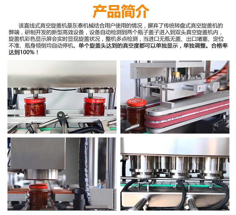 該直線式真空旋蓋機是東泰機械結(jié)合用戶使用情況,摒棄了傳統(tǒng)轉(zhuǎn)盤式真空旋蓋機的弊端,研制開發(fā)的新型高效設(shè)備,設(shè)備自動檢測到兩個瓶子蓋子進(jìn)入到雙頭真空旋蓋機內(nèi),旋蓋機彩色顯示屏?xí)崟r顯示旋蓋狀況,整機多點檢測,當(dāng)進(jìn)口無瓶無蓋、出口堵塞、定位不準(zhǔn)、瓶身傾倒均自動停機。單個旋蓋頭達(dá)到的真空度都可以單獨顯示,單獨調(diào)整。合格