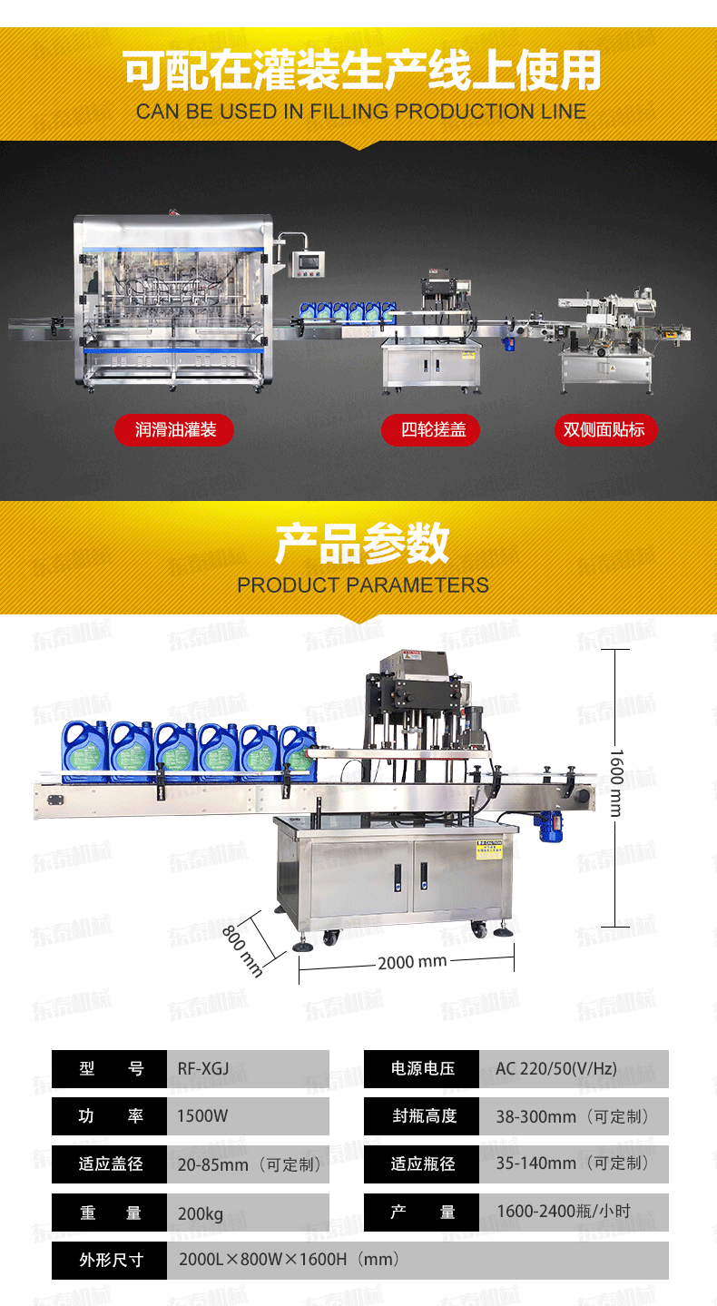 機油自動搓蓋機電氣控制運動,穩(wěn)定性強;  設(shè)有定位裝置,旋蓋標準,操作方便;  鎖蓋范圍寬,可鎖不同形狀規(guī)格的瓶蓋;解決了噴頭、泵頭、噴霧泵、手扣式噴頭旋蓋難的